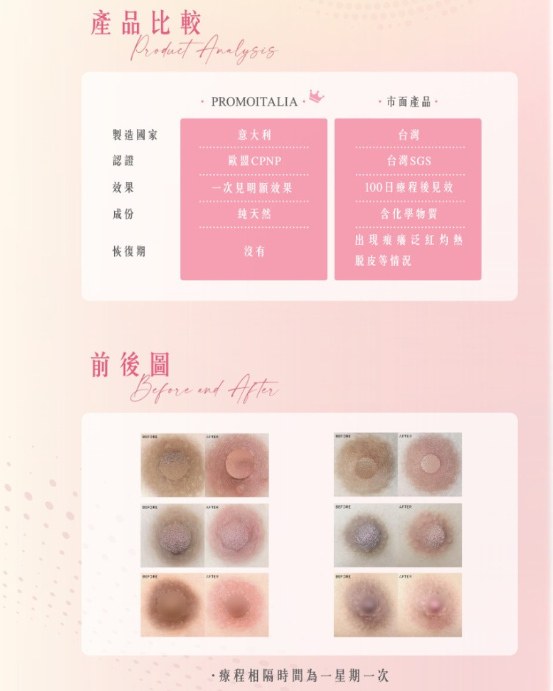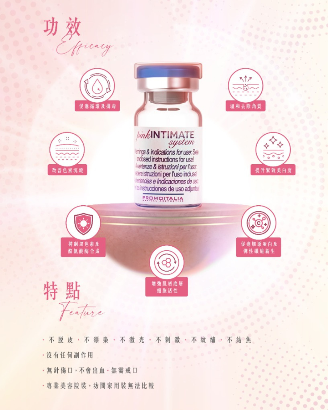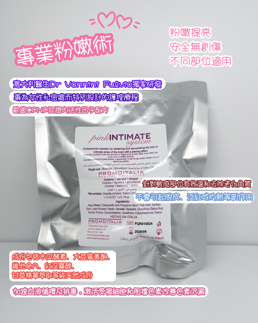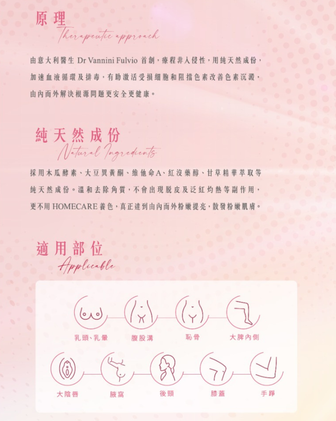 由意大利醫生Dr Vannini Fulvio首創,專為女性私密處設計的護理療程。 採用歐盟CPNP認證的純天然成分 溫和去除老化角質,加速血液循環,激活受損細胞,達致粉嫩提亮效果。 ✅ 安全無創傷,適用各類肌膚 ✅ 無刺激、無發炎 ✅ 促進膠原蛋白新生 ✅ 舒緩肌膚,無副作用 ✅ 適用範圍:私密處、乳頭、乳暈、腹股溝、恥骨、腋下、後頸和膝蓋等多個部位 「不脱皮、不漂染、不激光、不刺激、不紋繡、不結焦」 「無針傷口,無需戒口,專業美容院裝在家使用」 * 一星期進行一次 * 5次為一個療程 *一支精華可以進行1-2個療程